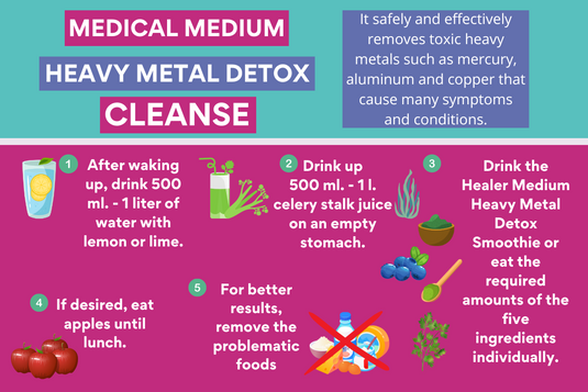 - Πιείτε το Smoothie Αποτοξίνωσης Βαρέων Μετάλλων του Healer Medium ( μπορείτε να δείτε τη συνταγή στο άρθρο "Smoothies Αποτοξίνωσης Βαρέων Μετάλλων" ) ή φάτε ξεχωριστά τις απαιτούμενες ποσότητες των πέντε συστατικών αποτοξίνωσης βαρέων μετάλλων:
